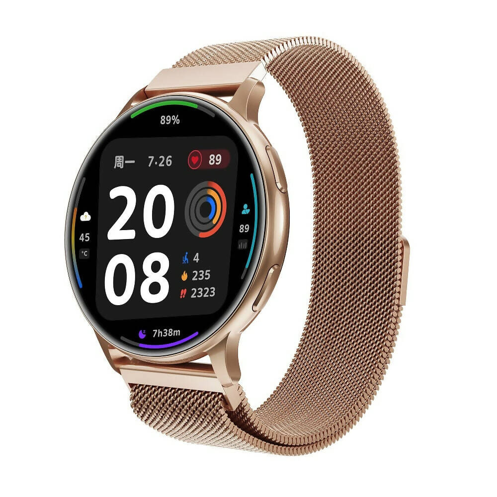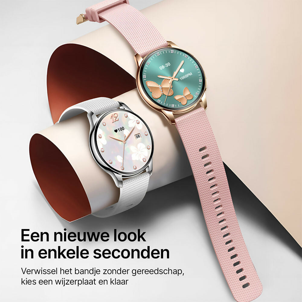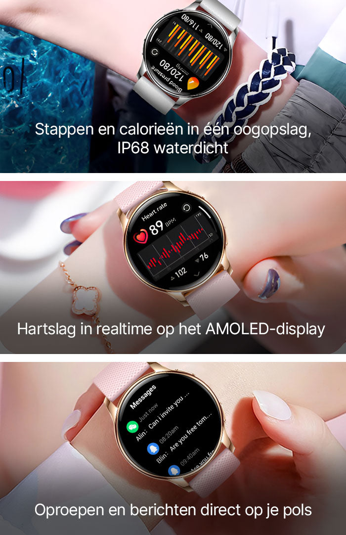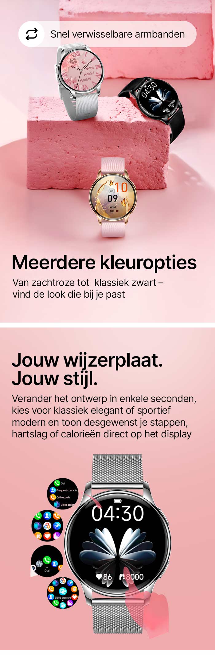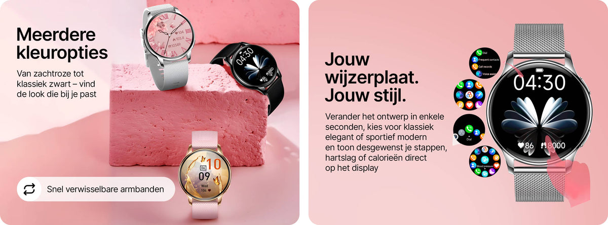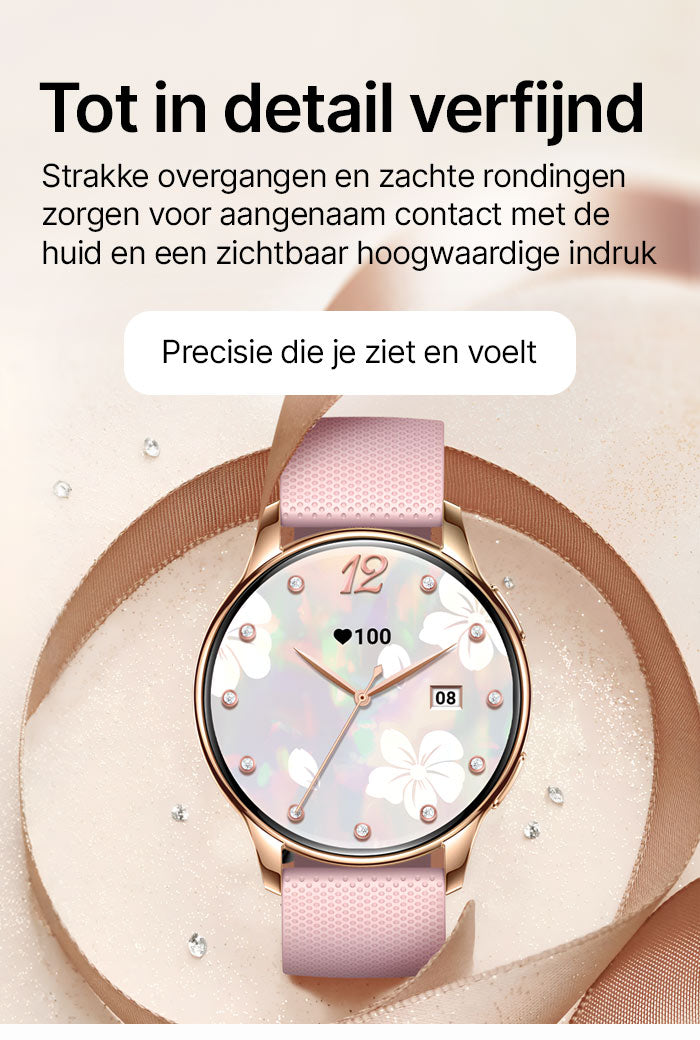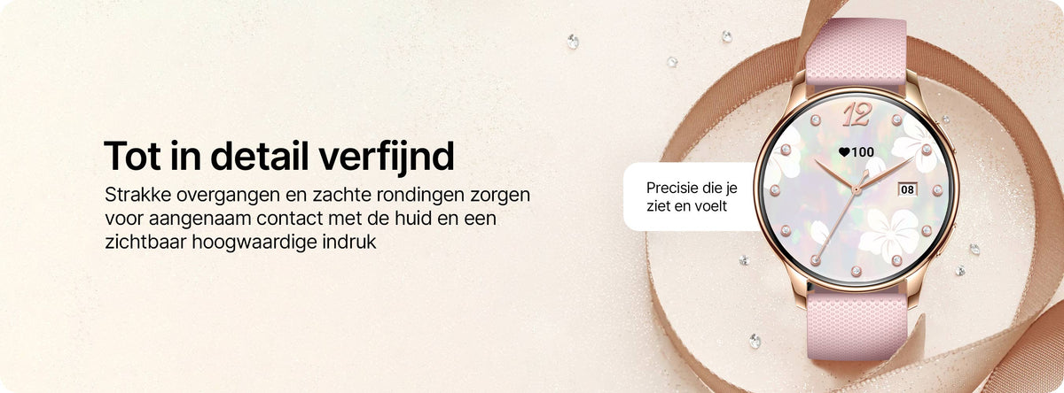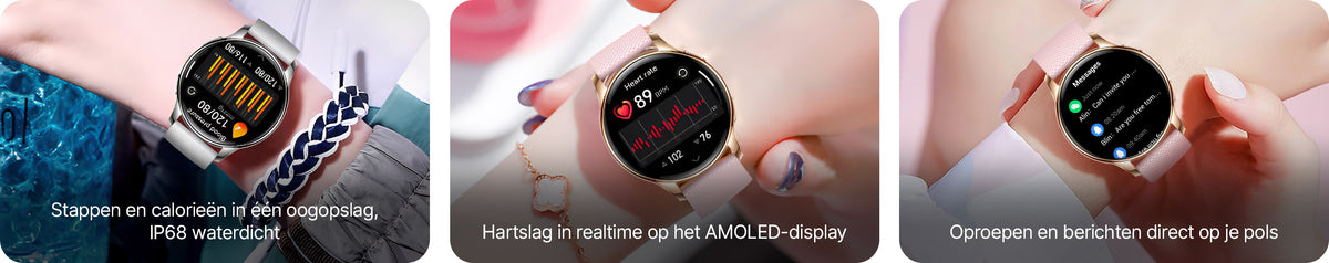 | Functies | Hartslag, bloeddruk*, SpO₂, slaaptracking, stappen/calorieën, stopwatch, wekker, muziekbediening, camera, Find-my-Phone |