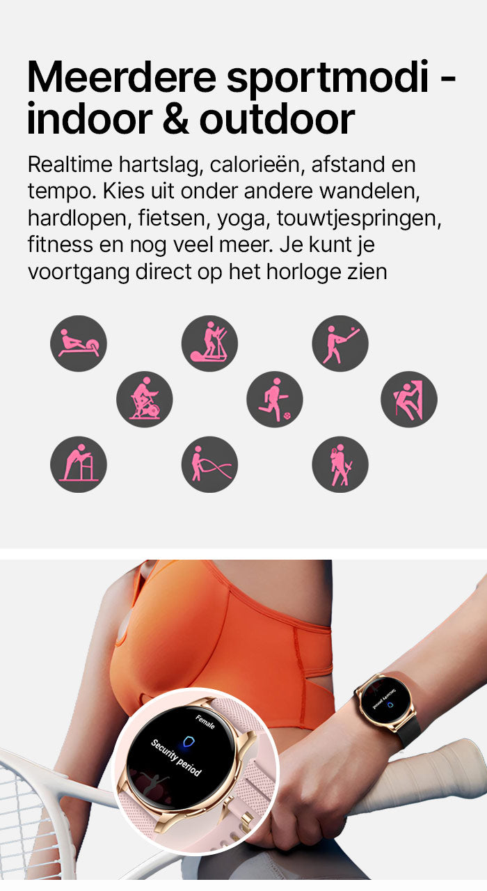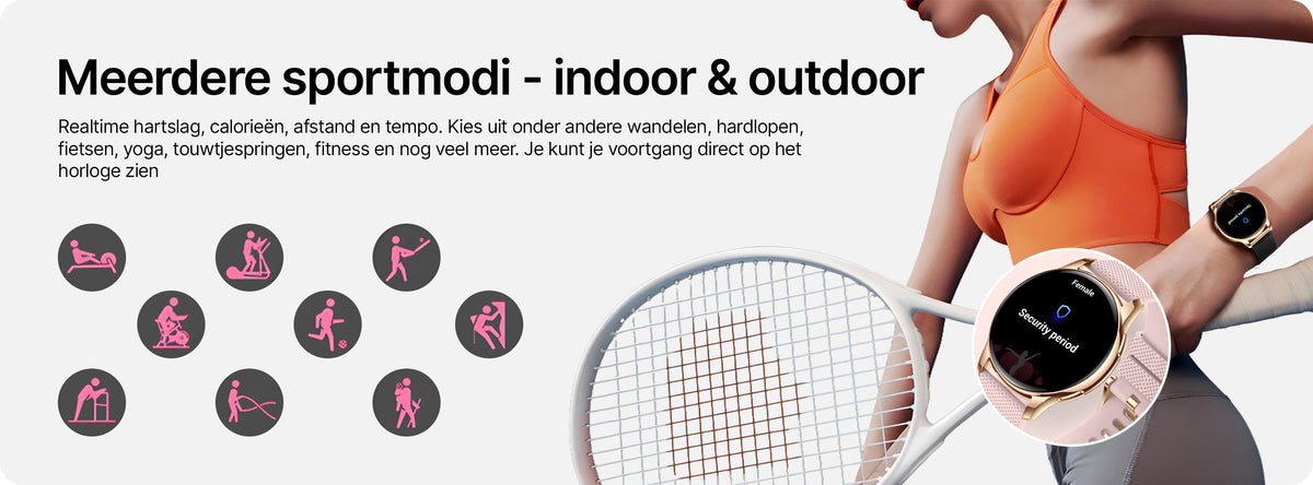 | Sportmodi | Indoor & outdoor, incl. hardlopen, wandelen, fietsen, yoga, fitness, enz. |