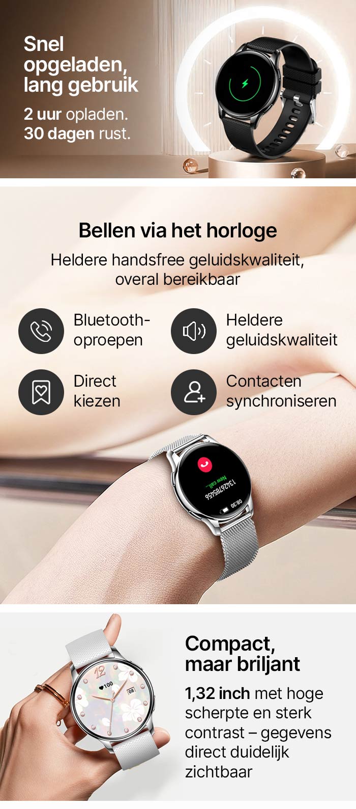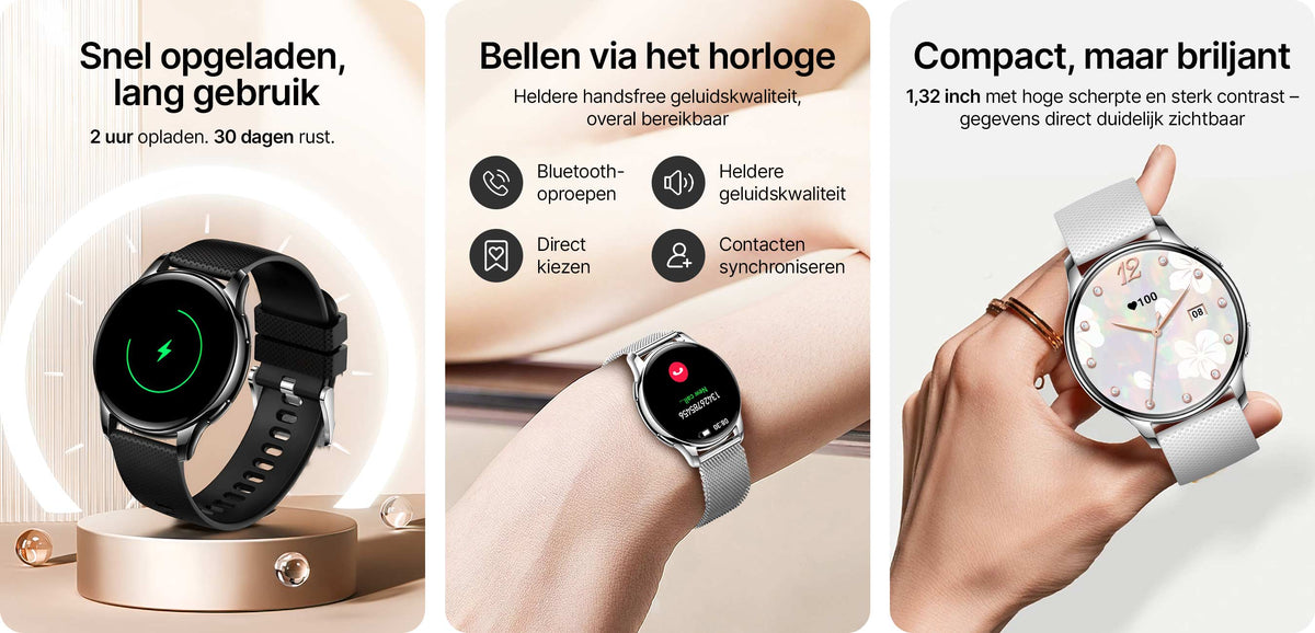 ca. 2 uur snelladen, tot 30 dagen stand-by (bij normaal gebruik, afhankelijk van instellingen)