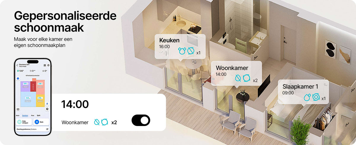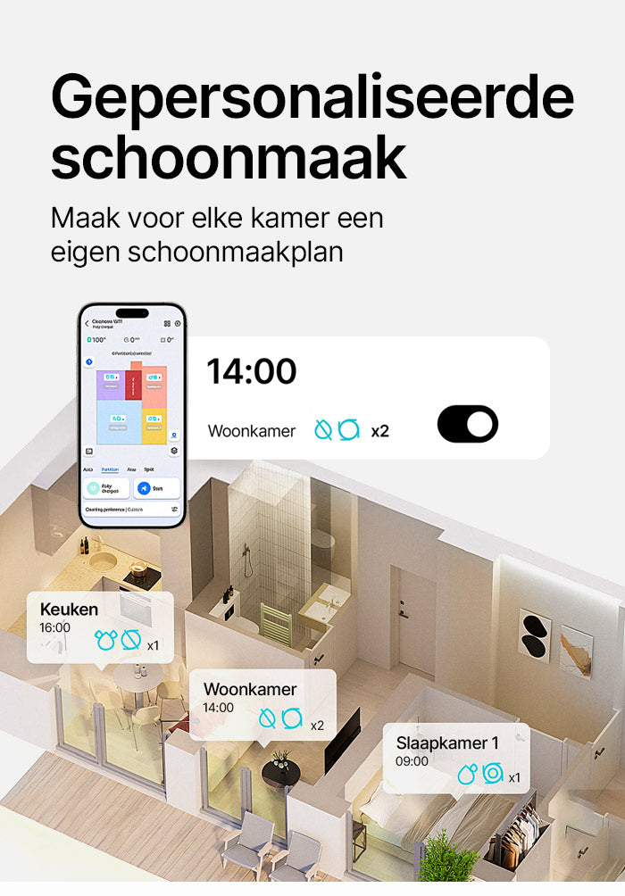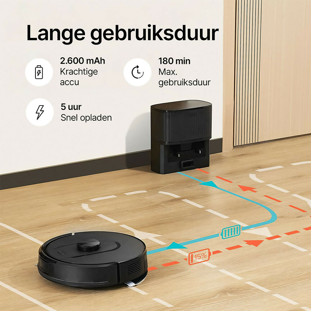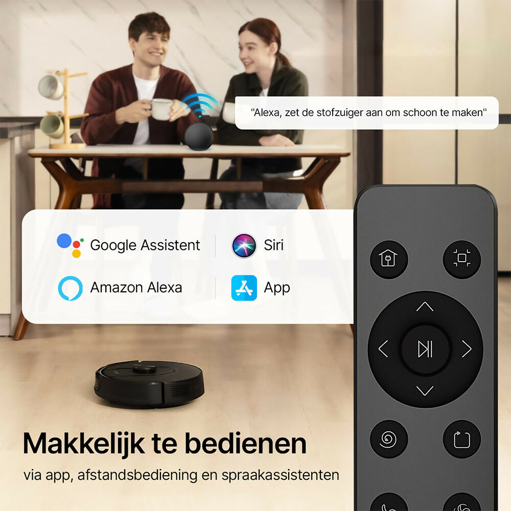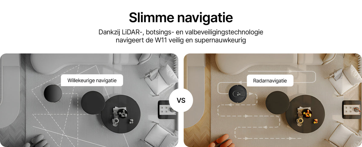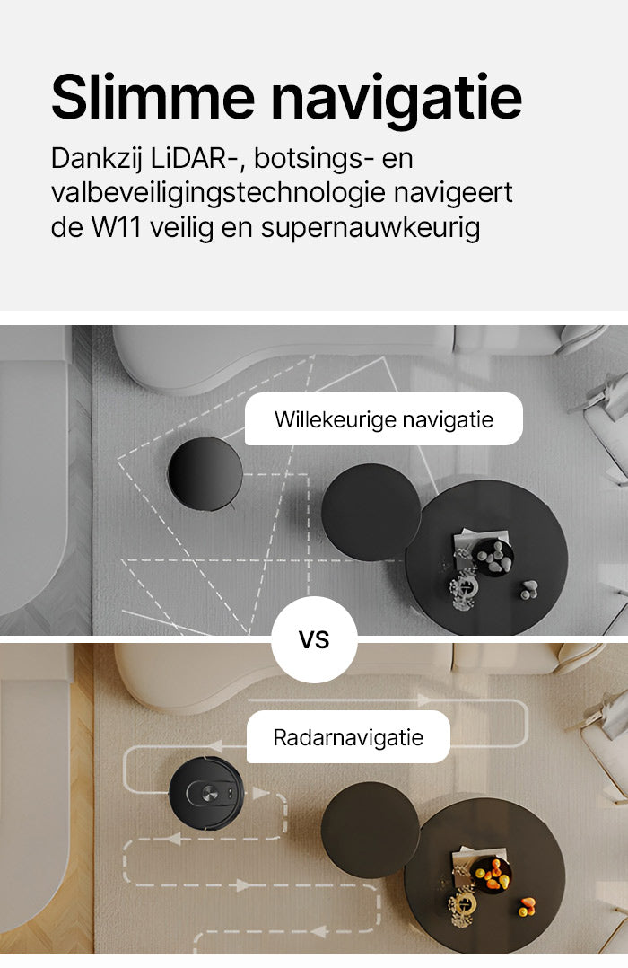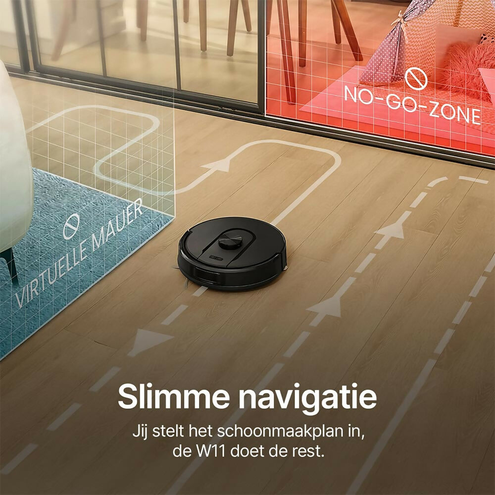 - ✓ Slimme navigatie: Dankzij de nieuwste LiDAR-technologie, botsingsbeveiliging en valsensoren navigeert de W11 precies door je huis. Hij gaat voorzichtig om meubels heen en herkent trappen en randen. Zo is elke schoonmaakbeurt efficiënt en precies.