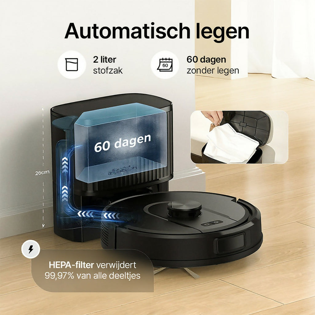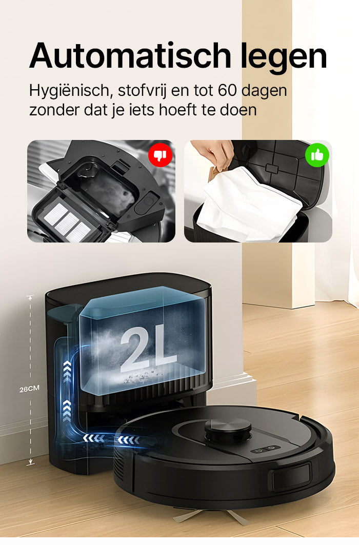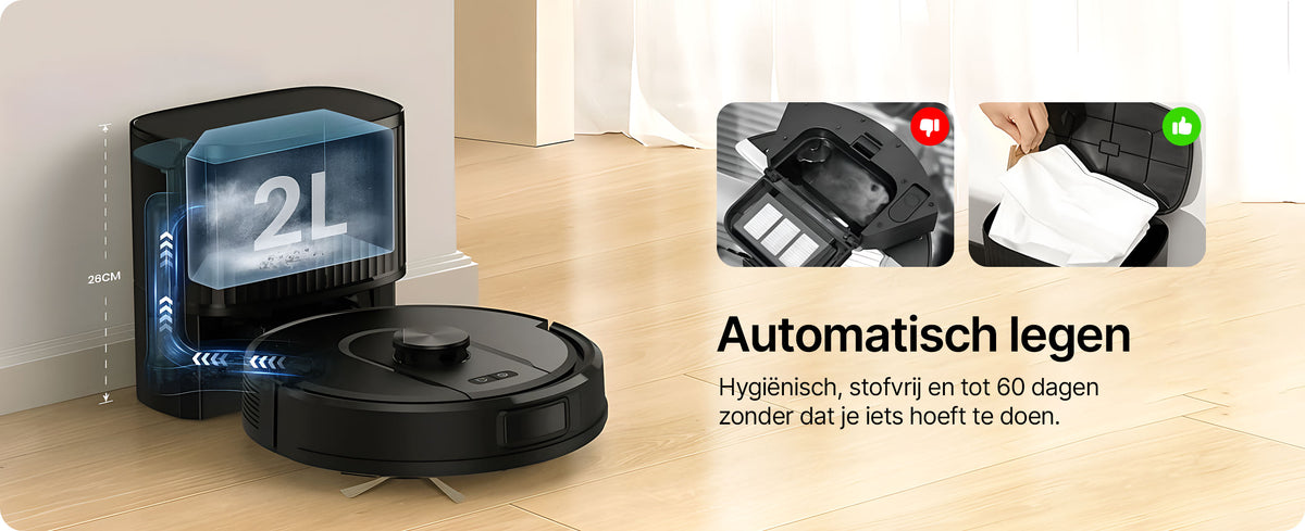 - ✓ Automatisch legen: Na elke schoonmaakbeurt maakt het station de stofbak hygiënisch en stofvrij leeg. De ruime inhoud van 2 liter is genoeg voor tot wel 60 dagen. Zo geniet je zonder moeite van een schoon huis.