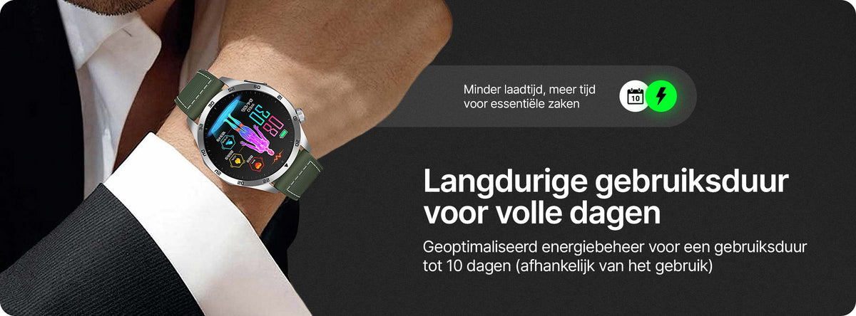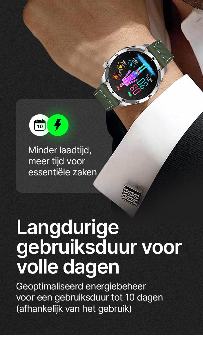 - ✓ Duurzame batterij: ca. 2–3 uur snelladen, 5–10 dagen gebruik, 20+ dagen stand-by (afhankelijk van de instellingen).